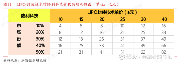 1.隆利科技:浙商证券测算:中性假设下,2025-2028年LIPO封装 的市场规模分别为0.61a、1.42a、2.11a、2.68a(亿元,a为LIPO封装单价)。以2028年采 用LIPO封装技术的OLED智能手机预期销量为4.1亿部为基数,假设a价格分别为10、 15、20、25、30、40元,隆利科技市场份额分别为10%、20%、30%、40%、50%,进行 场景假设。因此,若2028年采用LIPO技术OLED智能手机出货量4.1亿部,LIPO单价 20 元,隆利科技份额30%,则公司该业务的营收为25亿元。