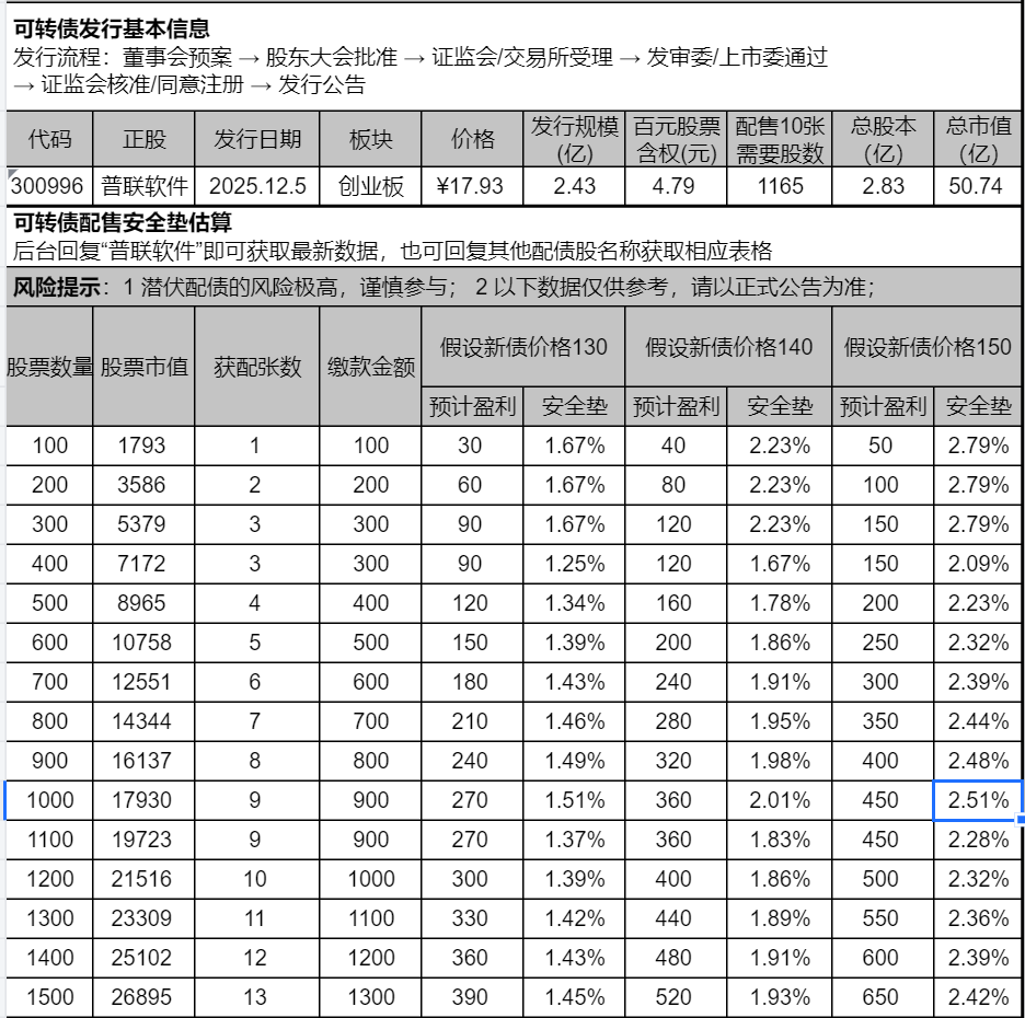 $普联软件(SZ300996)$ 发布公告,2.43亿的普联转债将于2025.12.5日发行!初始转股价为18.26,当前股价17.93,转股价值为98.19。每股配售 0.8598元可转债,1163股可以配1手,市值约20900元,百元含权为5,新债按照160的价格计算的话安全垫为3%;发行规模不大,大股东全额认购的话锁定20%的比例,流动规模大约1.9亿,上市以后被炒作的概率比较大,首日涨停应该没有悬念,中一签起码可以赚600块!查看图片