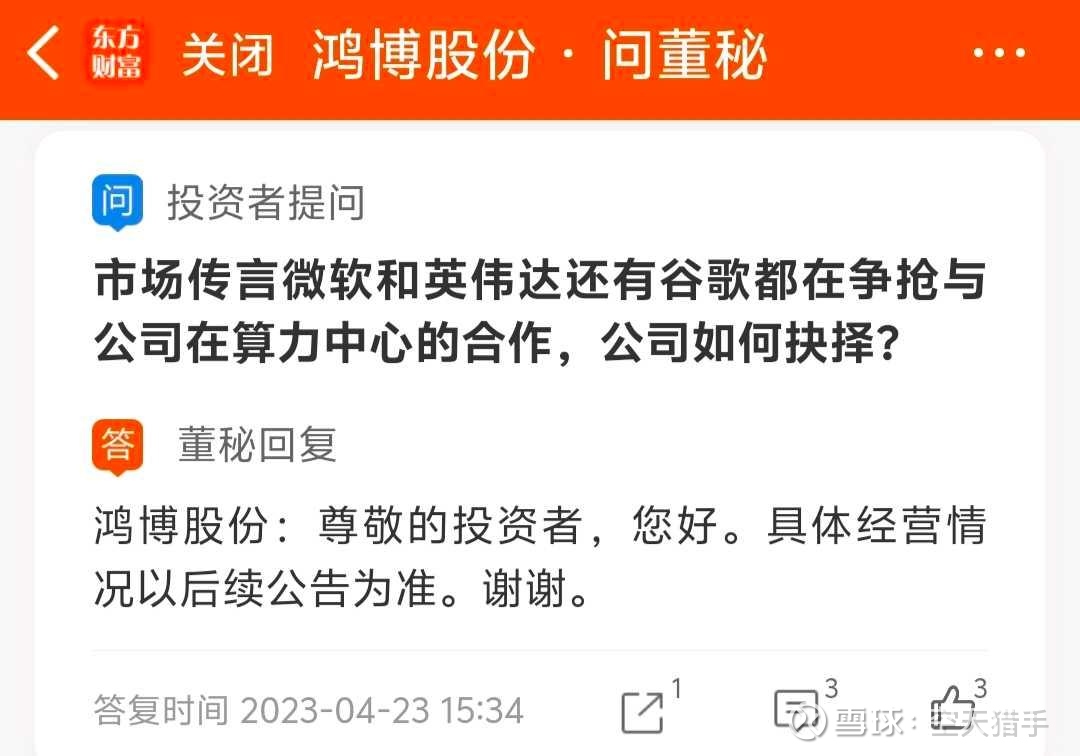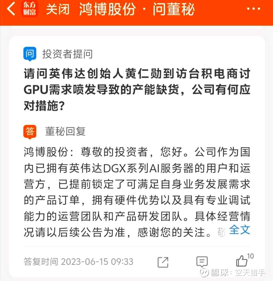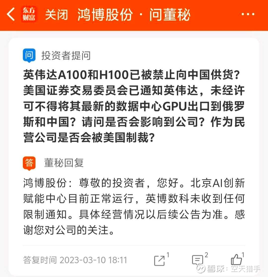 点评:董秘声称跟英伟达签订了合作协议,锁定了算力芯片供应订单,吹嘘自己是国内少有的能稳定提供英伟达算力服务的公司。明明美国禁止英伟达H100芯片对华销售了,鸿博股份董秘还放烟雾弹,说自己算力中心运营正常,潜台词不就是芯片有保障吗?还声称未收到美国任何限制通知,话说美国禁售英伟达芯片,还用得着通知你一家小破公司?你算老几?