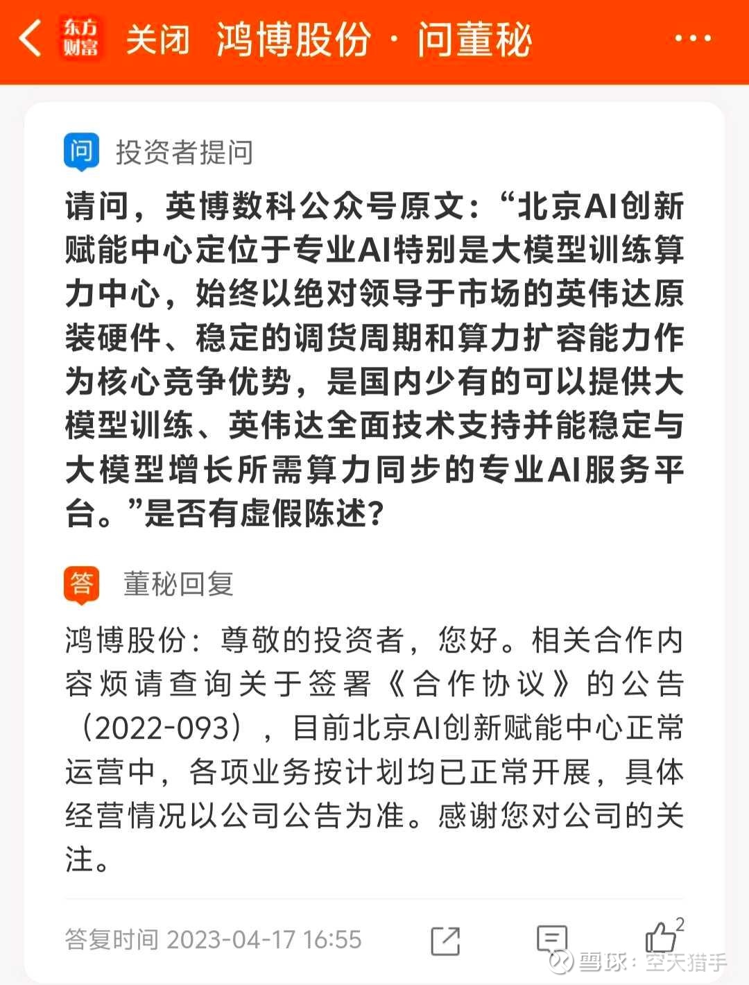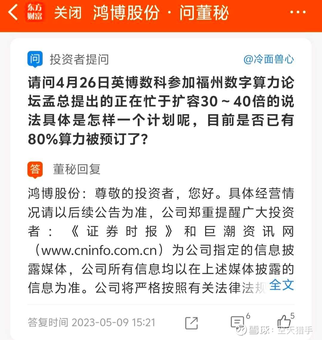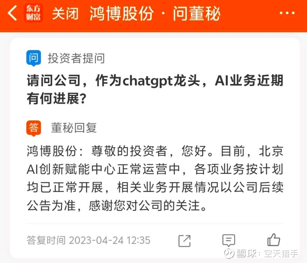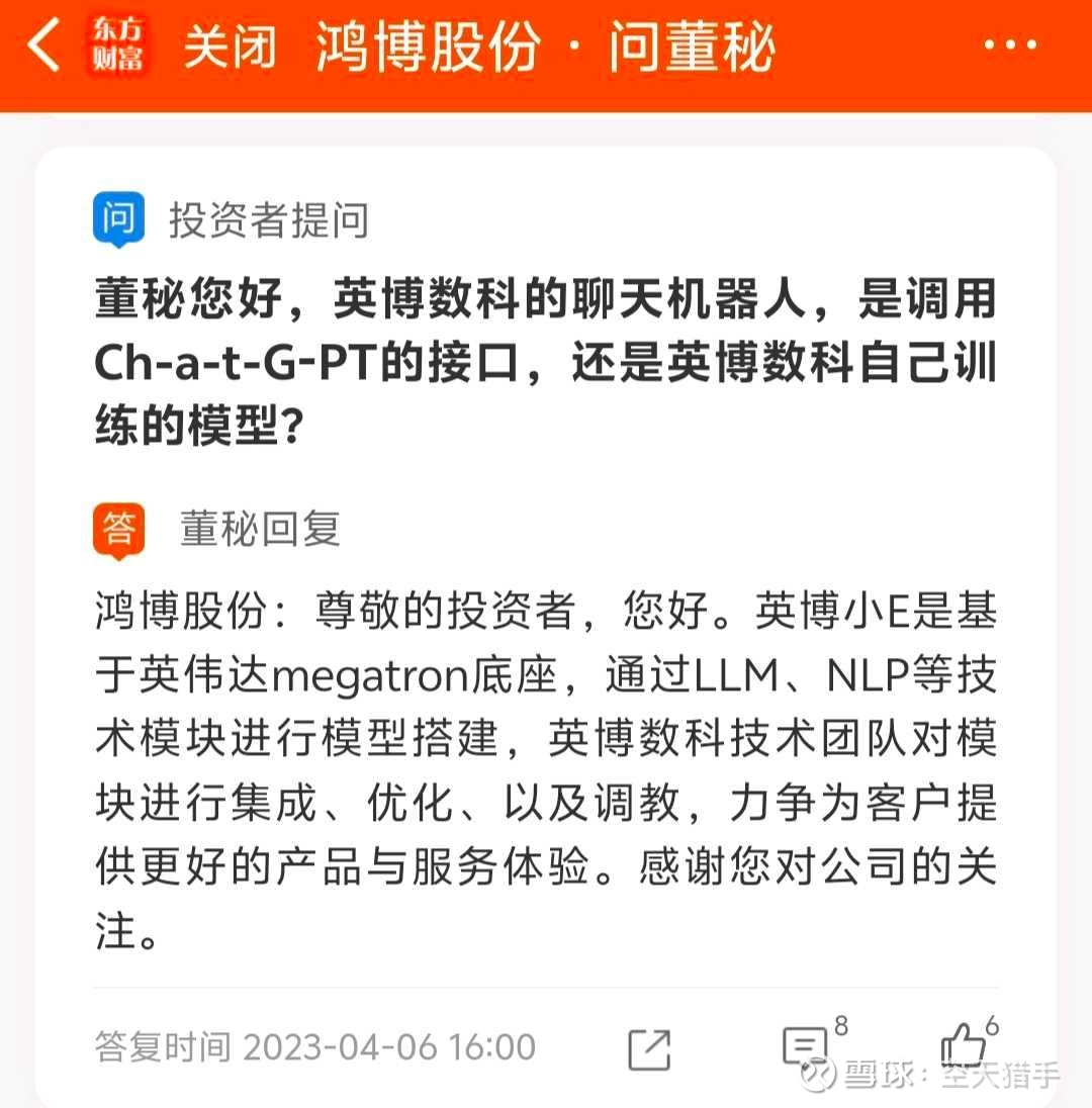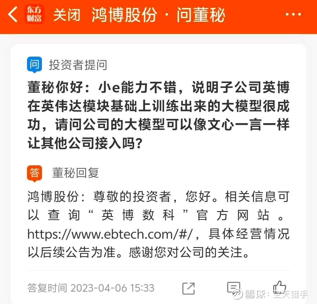点评:ChatGPT风头正火,鸿博股份搞了个噱头小E,股友问是公司自己开发的大模型,还是调用的ChatGPT接口,董秘又灌迷魂汤,说是自己公司团队搞的,只不过用了英伟达算力芯片。英博数科区区几十人的皮包公司,能干出媲美ChatGPT的大模型?