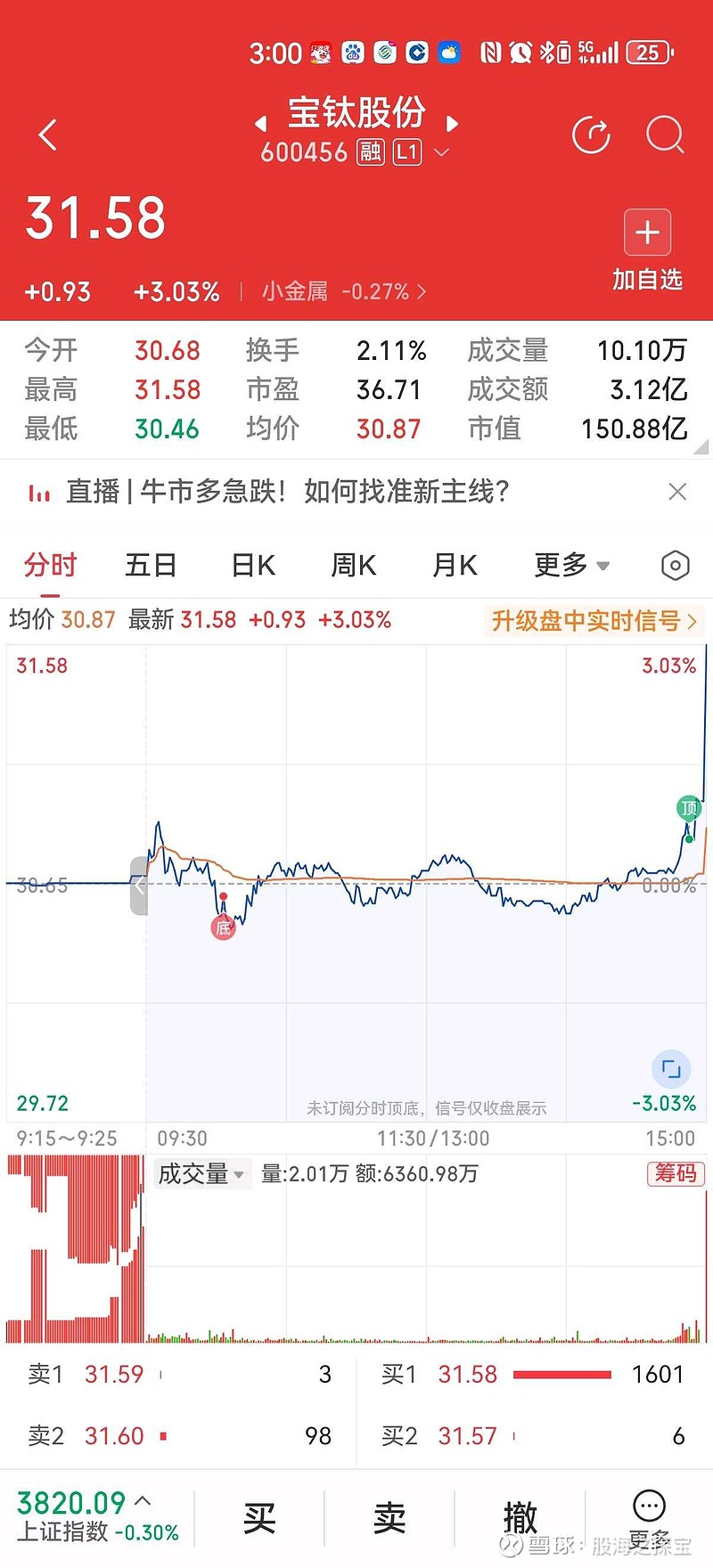 宝钛股份全天微跌,不知何故,临近收盘放量拉尾盘。拉尾盘一般下个交易日凶多吉少,其它股涨宝钛跌,已经跌倒250线附近了,还能跌倒哪里去?