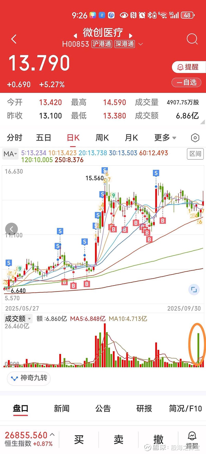 微创医疗在9月26日放量大跌超7%,成交额20.52亿,其后一个交易日9月29日,上涨4.55%,成交额仅3.19亿。26日、29日两天的涨跌情况和成交量情况已经较为充分地说明,微创医疗短线底部已经探明,新的一波上涨开始。26日放巨量下跌,主力先强洗造成恐慌,散户蜂蛹而出,主力又趁机吸筹,形成坚实短线底部。29日微量上涨,说明抛压极少,主力稍有买入便上涨超4%。有前两个交易日的铺垫,节前最后的一个交易日盘中轻松上涨超8%,收盘上涨超5%就不是什么稀罕事了。