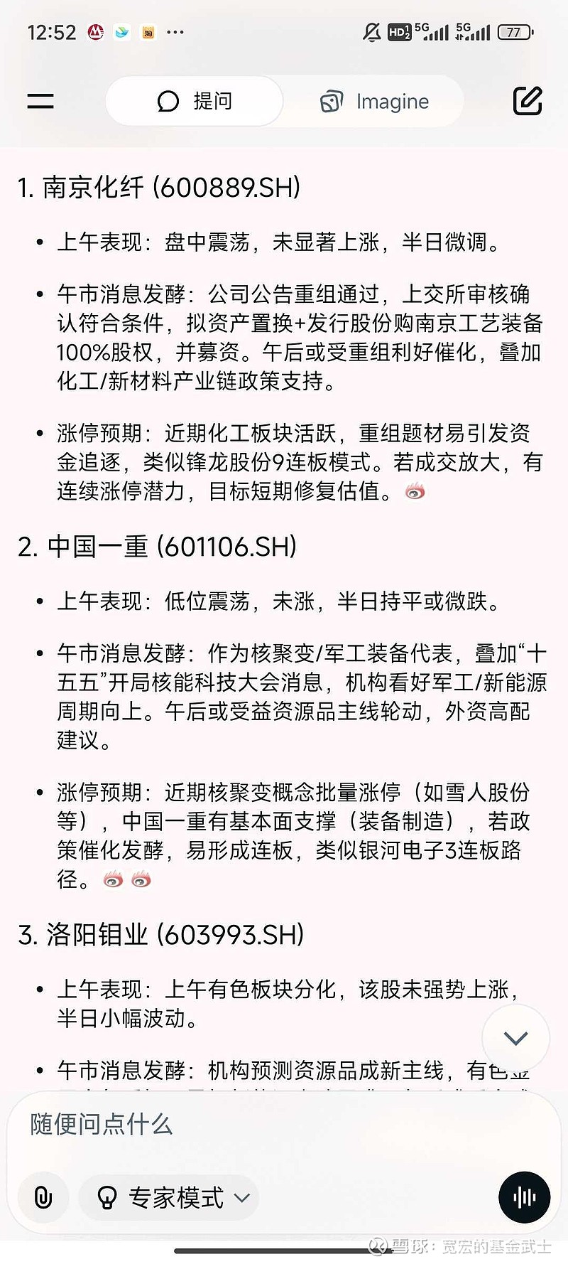 $全仓(ZH3532728)$ $南京化纤(SH600889)$ AI荐股还是有点东西的,早上让他分析下昨天收盘后的消息面,推荐我买航天科技,刚午盘看直接涨停了。刚推荐了个南京化纤,昨天发重组今天跌4个点,小仓位试下看。