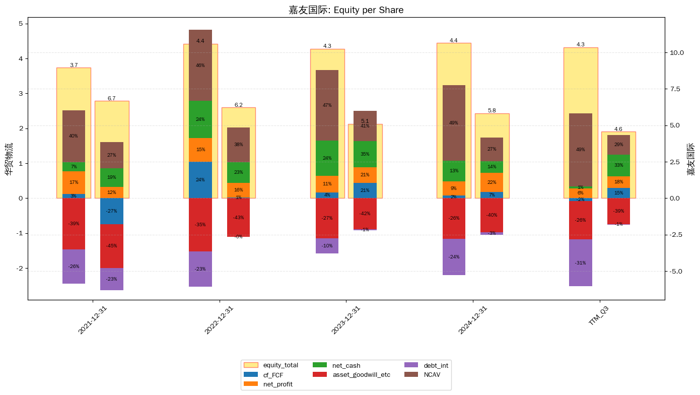 net_profit: 稀释每股归母净利润; equity_total: 净资产(稀释归母调节); net_cash: 现金及等价减去有息负债;debt int:有息负债;fcf:自由现金流(运营净现减capex);asset goodwell:资产表中的‘水分’,商誉,无形,研发,递延等