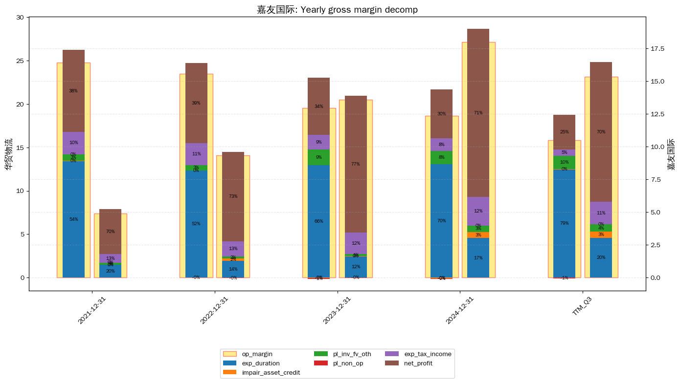 柱状图中的百分比为以下对"毛利"的比值: * op_margin: 毛利; * exp_duration: 运营费用; 销售费用+管理费用+财务费用+研发费用+营业税金及附加+堪探费用; * impair_asset_credit: 资产和信用减值; * pl_inv_fv_oth: 投资收益+公允价值变动净收益+汇兑收益+影响营业利润的其他科目+资产处置收益+其他收益; * pl_non_op: 营业外收入&支出; * exp_tax_income: 所得税; * net profit: 净利润; * Gross_margin: 毛利率