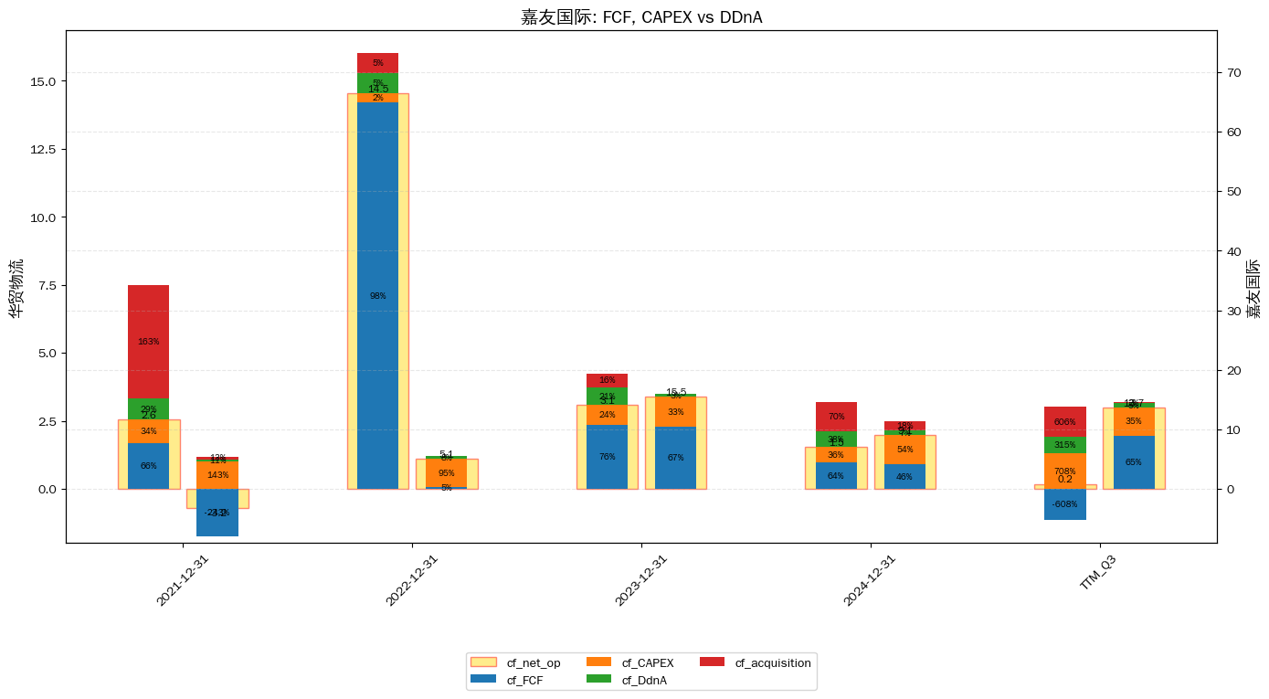 柱状图中的百分比为以下对"经营净现金"的比值: * cf_net_op: 经营净现金; 经营活动产生的现金流量净额; * cf_CAPEX: 资本开支(流量表); 购建固定资产、无形资产和其他长期资产支付的现金; * cf_DdnA: 折旧; 固定资产折旧、油气资产折耗、生产性物资折旧;* cf_acquisition: 并购; 取得子公司及其他营业单位支付的现金净额; * frac_fcf: 自由现金流/经营净现金