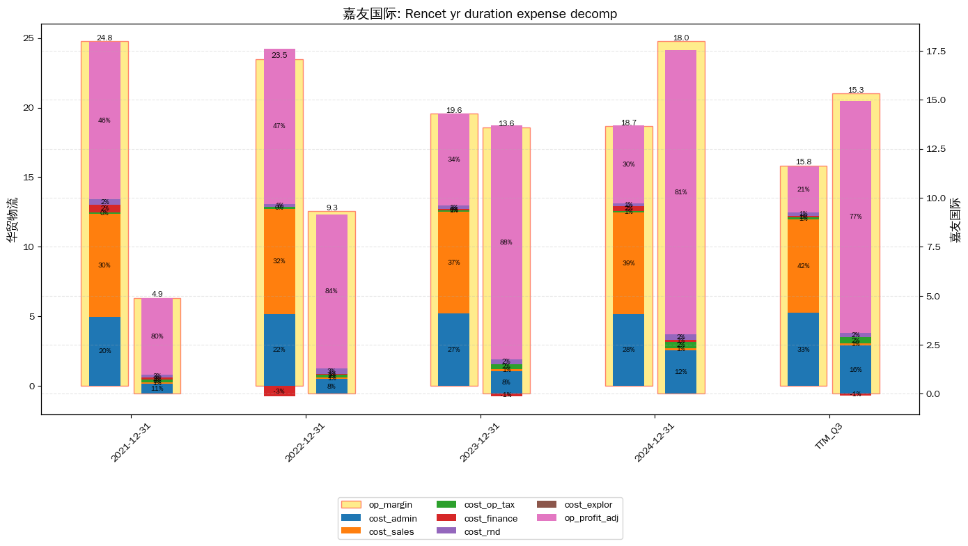柱状图中的百分比为以下对"毛利"的比值: * op_margin: 毛利,营业收入 减 营业成本; cost_admin: 管理费用; * cost_sales: 销售费用; * cost_op_tax: 营业税金及附加; cost_finance: 财务费用; * cost_rnd: 研发费用; * cost_explor: 堪探费用;