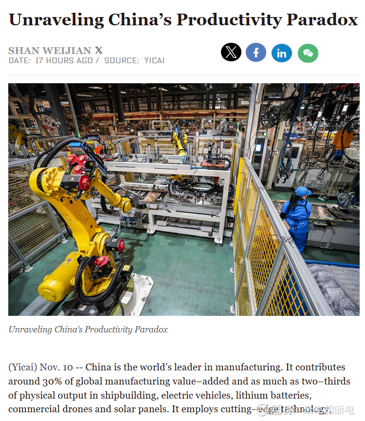(第一财经)11月10日电中国是世界制造业的领导者。它贡献了全球制造业增加值的约 30%,以及造船、电动汽车、锂电池、商用无人机和太阳能电池板的三分之二的实物产出。它采用尖端技术,到 2024 年将安装全球一半以上的工业机器人,机器人密度比美国高出 50%。它拥有超过 30,000 家智能工厂,包括全天候在没有工人或灯光的情况下运行的自主“黑暗工厂”。特斯拉的上海超级工厂每名工人生产的汽车数量是其加州工厂的两倍。
