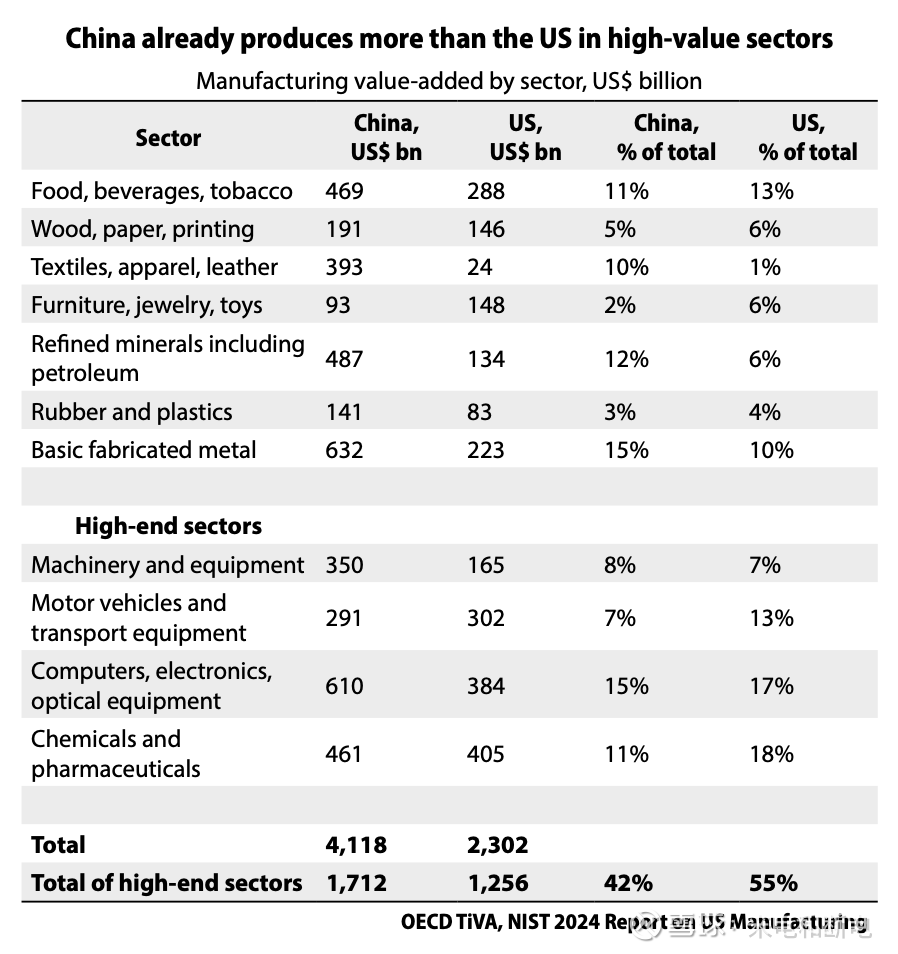 这就是为什么将美国制造业总价值(累加值除以员工人数)与中国进行比较就像将苹果与苹果和橙子的混合物进行比较一样。这两套根本没有可比性。