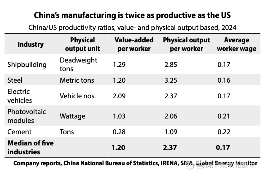 下表总结的调查结果令人震惊。在每个行业中,中国制造业的人均劳动生产率均高于美国,平均是美国的2.4倍。按名义增加值计算,中国优势缩小到平均1.2倍。水泥是异常值:中国人均实物产出略高于美国,但由于价格差异巨大,按名义增加值计算的生产率为美国工人的 28-50%。(所有行业两年的完整数据见附录。