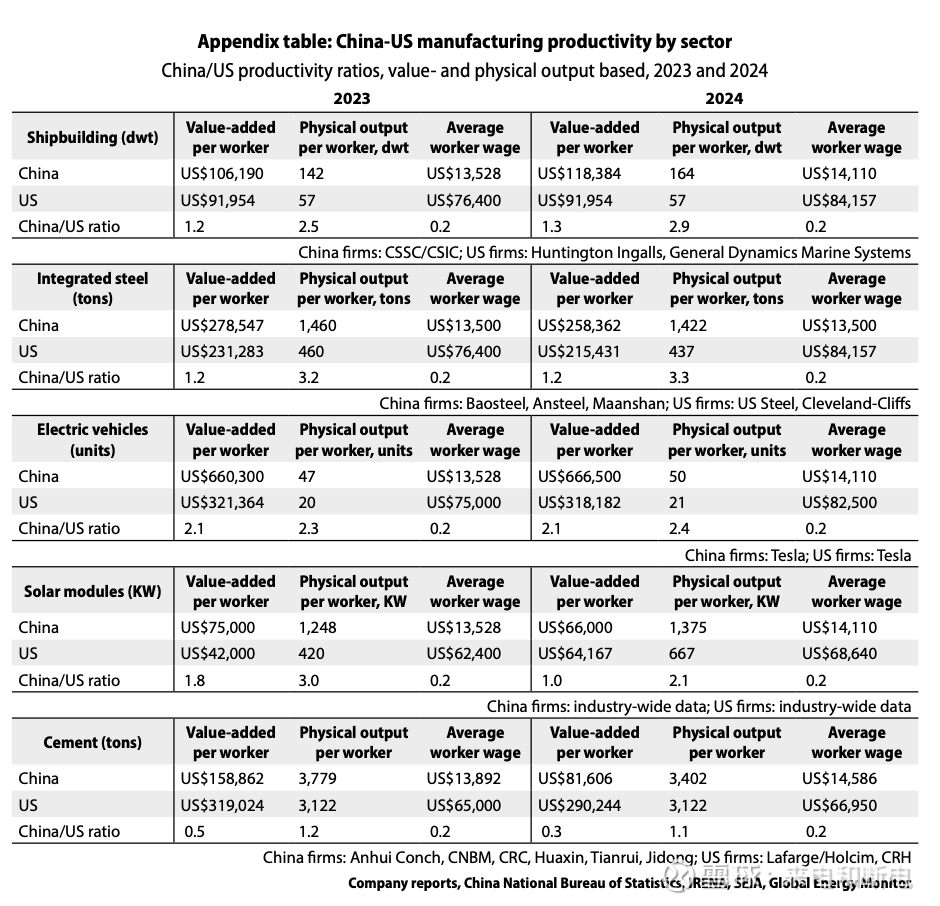 在这项研究中,我研究了美国和中国有五个主要生产商的行业,这些行业可以衡量实物产量:造船、综合钢厂、电动汽车、太阳能光伏组件和水泥。除了全行业数据被认为是可靠的太阳能组件外,劳动生产率数据来自上市公司的年度报告或 10-K。电动汽车数据来自特斯拉,该公司在加利福尼亚州和上海经营超级工厂生产相同的车型。