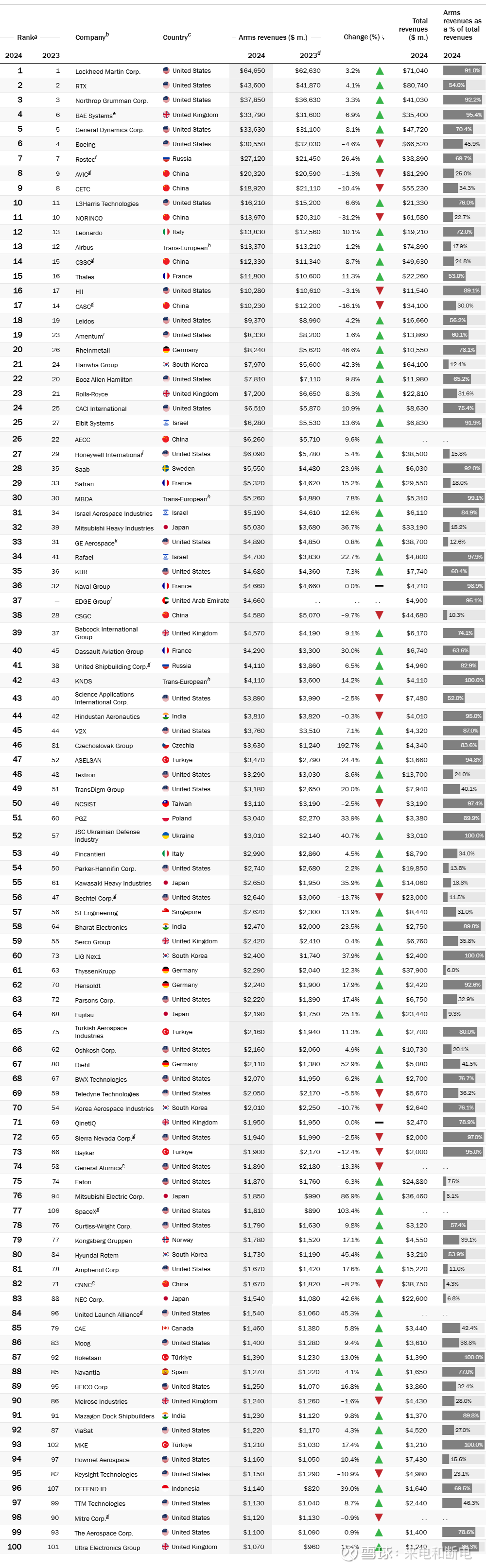 斯德哥尔摩国际和平研究所(SIPRI)近日公布了2024年全球100大军火公司名单。