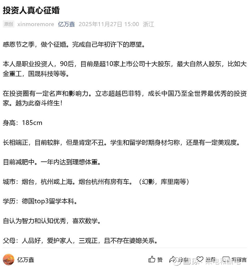 11月27日,公众号“亿万鑫”发出一篇文章《投资人真心征婚》。该文章自述称,其是90后职业投资人,是多家上市公司的十大股东之一、最大自然人股东。