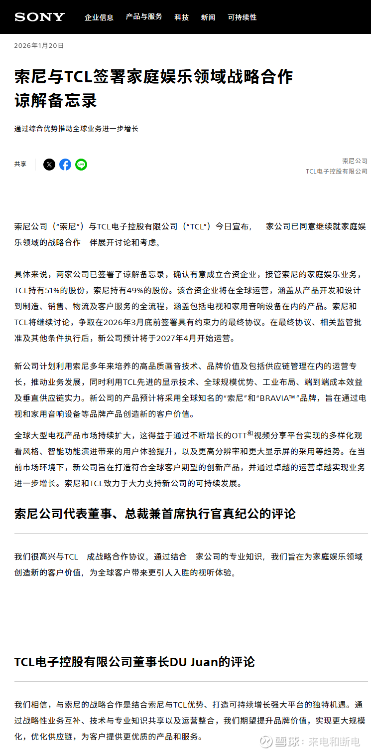 2026年1月20日索尼官方与TCL电子控股有限公司同时宣布,双方已签署家庭娱乐领域战略合作意向。根据披露内容,双方确认拟设立一家承接索尼家庭娱乐业务的合资公司,其中TCL持股51%,索尼持股49%。