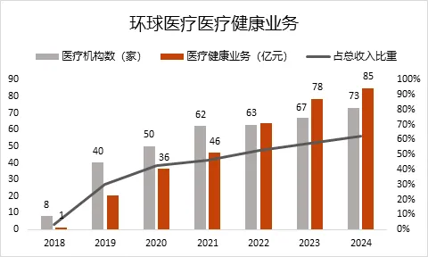 具体过程暂且按下不表。从结果来看,上市十年后,环球医疗已经从一家金融租赁公司转型为综合性的医疗健康集团,旗下拥有近70家医疗机构、1.6万张床位,规模居国内上市公司第一梯队。近两年更是把业务触角延伸到了医疗服务的上下游——医疗设备维保和养老领域,布局多元健康产业的信号已经非常强烈。