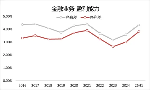金融业务方面,前几年受到外部环境影响盈利能力收窄,2023年开始有触底回升趋势,目前核心盈利指标净利差和净息差都处于持续改善通道,上半年净利差3.82%,较去年同期上升0.96个百分点,净息差4.34%,较去年同期上升0.92个百分点,也展现了相对稳健的运营能力。