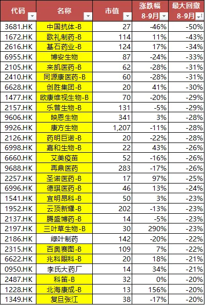 最近,我们发现前期涨幅较大的品种,出现了较大的回撤,我按照回撤幅度排序,梳理了一张创新药股价表现表格。