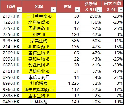 我们看到过去2个月涨幅最大的是三叶草生物,涨幅接近300%;北海康成也迎来了第二波上涨,涨幅150%;圣诺医药也涨了接近100%;
