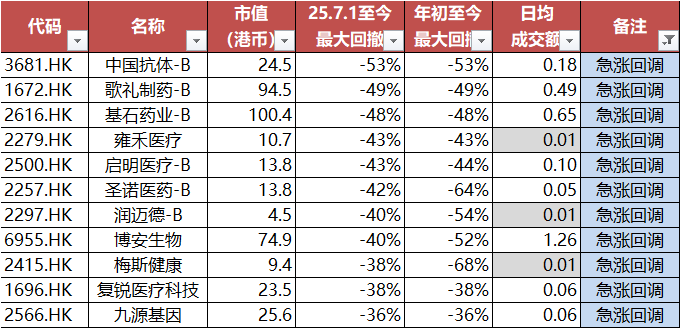 近期有一波质地不错,前期大涨一波,近期由于减持、配股以及预期没落地等因素,出现了较大幅度的回撤。不乏基石药业、歌礼制药、中国抗体等前期大涨明星股。当然也有梅斯健康、润迈德等下行趋势公司近期出现大幅波动,从而有大幅回撤。