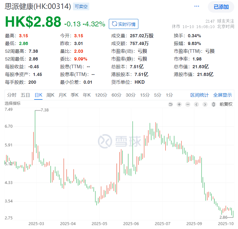 思派健康:公司讲的是DTP特药药房+SMO新药临床+商业健康险的闭环业务逻辑。而今年6-7月份,国家准备推出商业健康保险的丙类目录,股票还有一波80%的涨幅。但随着退出港股通,近期一波接近60%跌幅,把前期80%涨幅基本都跌没了,而且股价创下了新低。三块业务是否能够闭环,我们无法预判,但各项业务本身都有自身价值,40亿规模的院边店+4亿规模的SMO+2亿规模的商业健康险,在各自细分领域都有一定地位,最重要、也是最实际的目标,还是如果把传统业务的盈利能力提高上来,把规模效应业务的收入快速扩张。当然,即使短期不盈利,但公司账上有11亿净现金,而市值只有22亿,相当于业务价值只有10亿左右,仍然属于很便宜的估值水平。只不过在市场热度过后,只有把业务真正做到闭环联动效应、把盈利做起来,才是真正能够让企业内在价值提升,股价再次上涨的根本驱动力。
