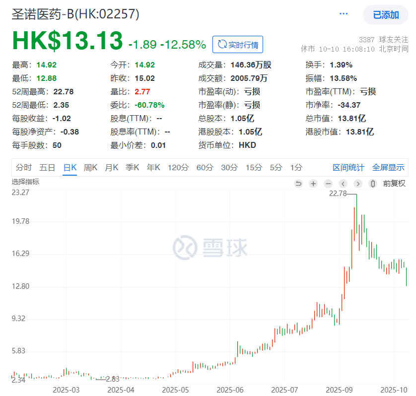圣诺医药:创新药牛市环境下,小核酸成为重要新技术投资方向。如果说有一家只有几亿市值的小核酸股票放在你面前,你是否会参与一把?——这就是圣诺医药这支票虽然换了大股东,管线也好久没进展了,但却依然能够涨几倍的最核心逻辑,更何况涨上来之后华熙生物还参与了定增。虽然这个票暂时还没办法看原有管线的临床进展,但启动前只有3亿市值,而且新大股东真金白银换进来,总会YY有所动作,然后在创新药牛市和小核酸技术火热的情景下,从3亿涨到了20多亿,最多涨了7倍。现在回调到14亿左右,绝对值仍然很便宜,但有点缺乏估值锚定,再往下一点12块钱应该就到了华熙生物的配股融资价格,算是能拉一个垫背的!