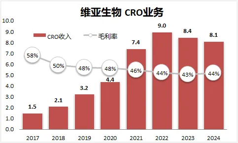 但2022年之后,投融资进入下行周期,连带着维亚CRO业务也处于收缩战线的状态,收入端个位数下滑,2023年也做了大幅的减员增效,整体毛利率也保持在44%的水平。