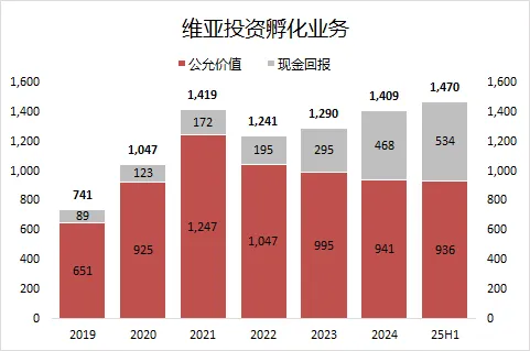 但是到了2022年,开始进入资本寒冬的时候,维亚也开始降低新投入资金。我们看到2022年以后,累计投入资金差不多就是维持在11亿左右规模,不再新增投入。所以,2025年看到的基本都是2022年孵化的早期创新药股权。
