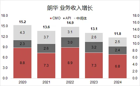 简单来说,朗华收入里面40%的仿制药原料药和贸易业务不赚钱,真正赚钱的是占比60%的CMO业务。而CMO业务在2020-2024的收入体量保持在7-9亿之间,变化不大。这也导致维亚生物CMO业务板块这几年不显山漏水。
