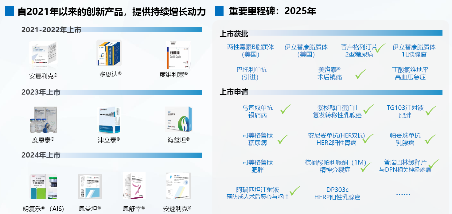 当然25年开始就又开始有成集群的产品上市,即将获批的新通用名的格列汀+MG重症肌无力抗体,申请上市阶段的乌司奴单抗、帕妥珠单抗 类似药、司美格鲁肽以及自研的GLP-1、康宁的HER2双抗——这些药其实都是不错品种,各自适应症都有不错的竞争力。也开始逐步体现收入弹性,所以我觉得2026年开始,石药制剂业务应该进入触底回升的状态;