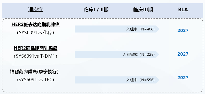 HER2双抗ADC则对标8201布局了乳腺癌和卵巢癌,也是出于临床后期阶段;