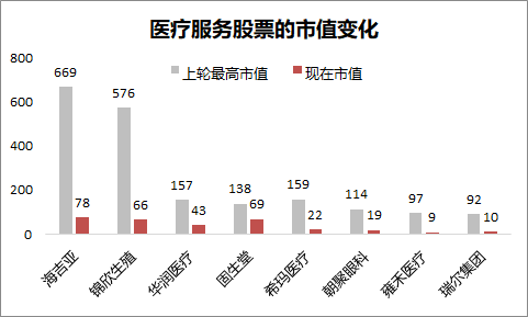 上一轮海吉亚(肿瘤)、锦欣生殖(试管婴儿)、雍禾(植发)以及眼科、口腔、中医等不同类型的连锁医疗服务机构都给了不错的市值溢价。但这一轮牛市中,已经沦落为牛市熊股,一方面是疫情之后这几年的外部消费环境偏弱,另一方面耗材集采政策、医保DRG政策,也让连锁医院短期承压。所以,现在是医疗服务的市场低迷估值阶段,像海吉亚、锦欣等,市场只给了不到100亿市值,而上一轮市场热度高的时候都给了600亿级别的市值;