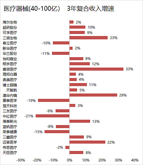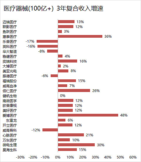 我今天复盘了一下医疗器械板块过去3年的收入复合增速,发现除了个别处于高景气度细分赛道的公司,譬如电生理、内镜、瓣膜、神介,其他大部分领域的经营状态都相对低迷。但即使高景气赛道,市场也提前把预期给起来,现在看惠泰、电生理、澳华、爱博、赛诺都是表观估值给得比较高的状态,背后也是对高景气领域高增长的期望。