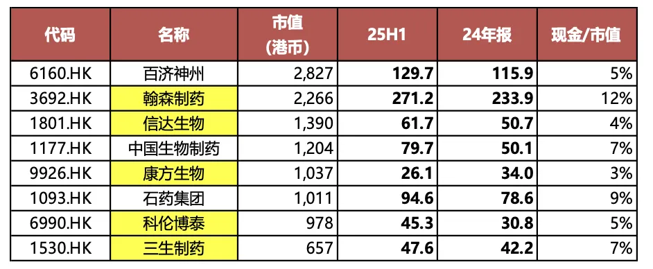荣昌生物:荣昌属于大票里面账上比较缺钱的Biotech,账上净现金是-10亿,而且研发投入比较多,但商业化品种的现金流入不够,其实比较需要补血。荣昌在5月份融资了8亿,然后把泰它西普BD给Vor,有4500万美元首付进账。所以,25年荣昌差不多补血了10亿级别的现金。