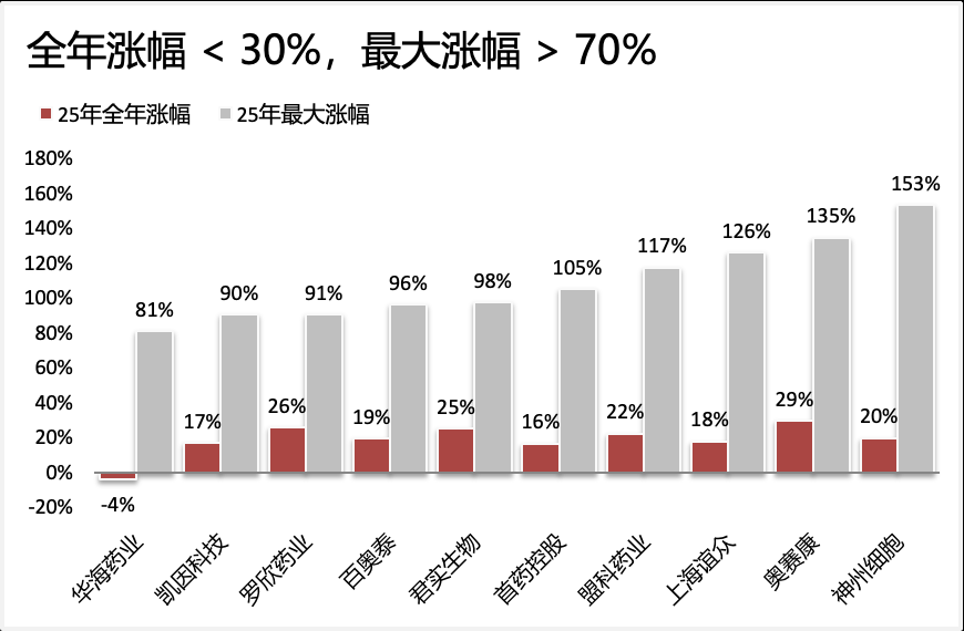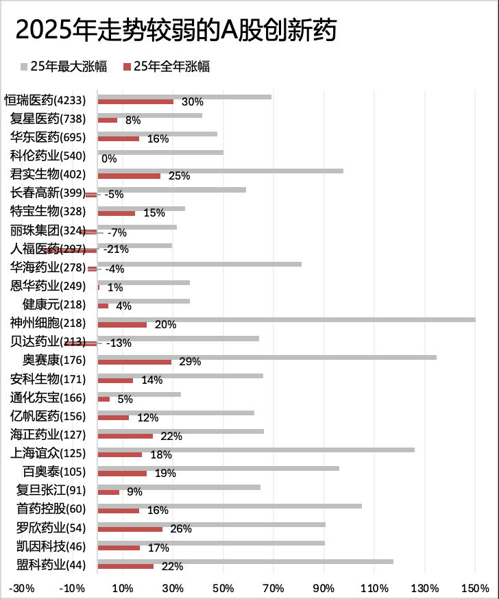 我们梳理了2025全年涨幅不超过30%的创新药票,并且分为两类,一类是全年整体涨幅和最大涨幅(振幅)都不大的票,另一类是曾经涨幅较大,但回撤也较多,导致全年整体涨幅小。