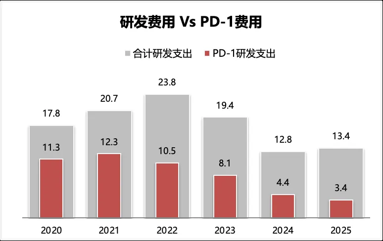 2、研发支出:君实经历了20-23年的研发投入高峰期后,过去两年内研发支出大约13亿左右,算是国内研发第二梯队(10-15亿)选手。但如果拆分历史的研发支出,发现占比最高的就是PD-1,截至25年已经投进去63亿,很显然现在特瑞普利还没有赚回研发投入成本的状态。其次BTLA、IL-17、PCSK9都是累积研发支出超过5亿的品种——但是很显然,历史上较多研发沉没成本对应的管线并没给出较高的内在估值,反倒现在开始重点投入的PD-1/VEGF支撑了较高内在价值。