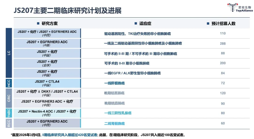 这个热门靶点造就了康方、三生、荣昌等多大超级BD,君实生物因为布局时间较晚,暂时没有特别多数据读出,导致错过这个靶点的这波BD热潮。但从研发布局看,君实应该是PD-1/VEGF靶点在国内临床规划最为完整、联用方案最丰富的玩家。如果说君实在这个靶点有机会弯道超车,那么机会可能来自于与自家其他靶点联用带来的惊喜!