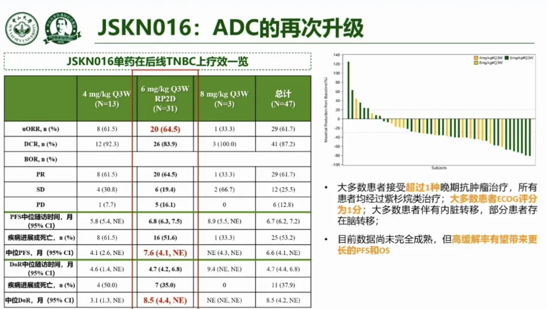 康宁杰瑞ADC平台突破性产品聚焦到016,一款Trop2/HER3 ADC。作为Trop2靶点的经典适应症,016最先尝试的也是后续三阴乳腺癌。在研发者日中,专家晒出了这款药物的临床数据,6mg剂量组ORR接近65%,PFS7.6个月——这个应该大家见到的后线三阴乳腺癌最好的临床数据。而近期016也开了360人的国内临床3期。希望康宁能够依靠这款药物再次验证自身ADC技术平台的优秀,也能够从046研发翻车的阴影中走出来。
