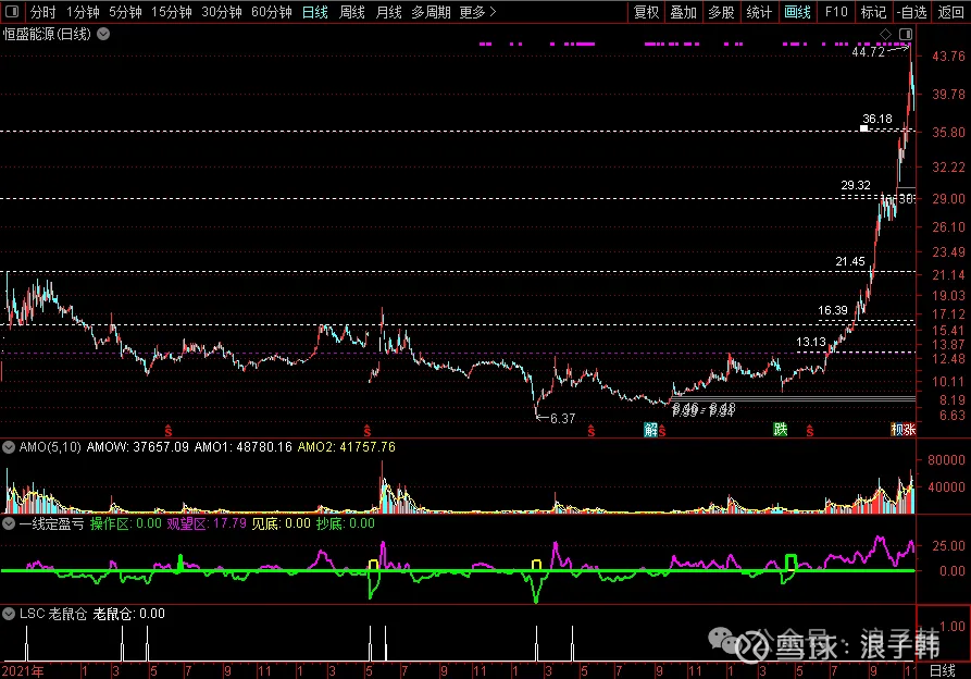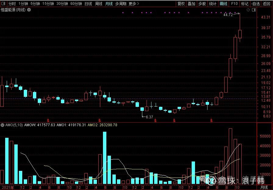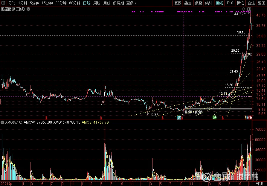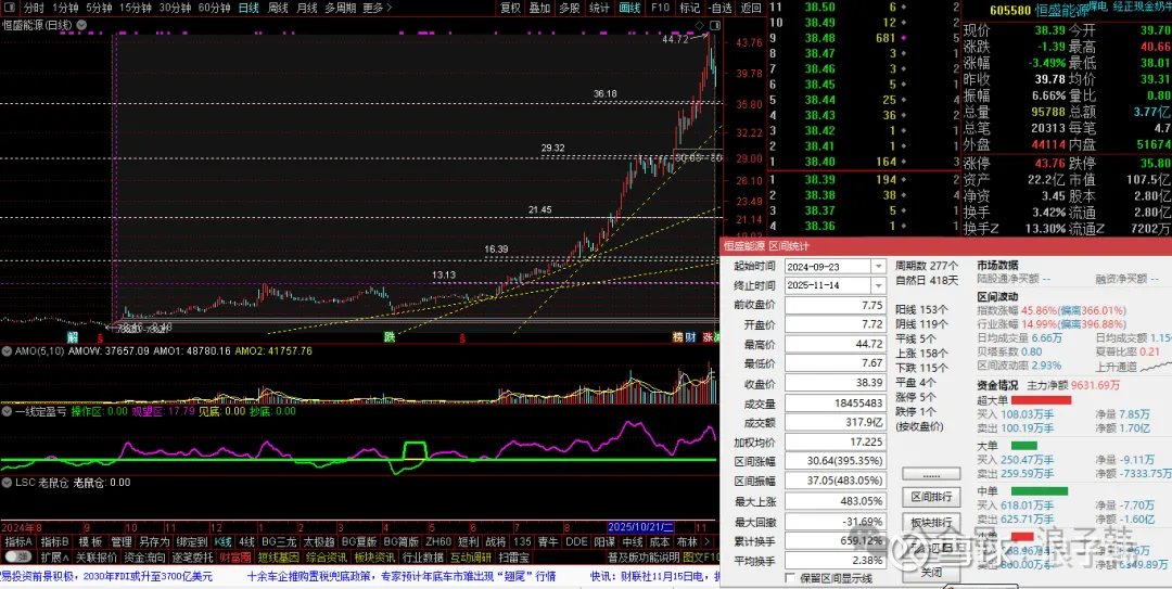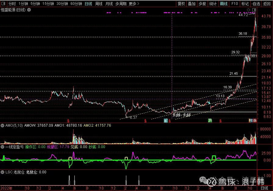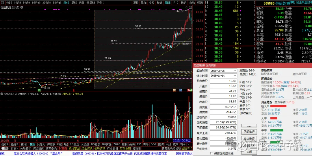 6、恒盛能源中期走势形态(子韩点评:该股2025年6月26日突破13.13元产生日,从此走出青云步,用了96天(约5个月左右)的时间,拉升到44.72元,由此完成阶段性的5倍之旅,未来?是否还能继续震荡上行,依然值得我们为之期待和观察,虽然个股的确需要想象力,但是,到达天价区域后,风险和震荡幅度都会加大,请一般散户投资者谨慎观察!切忌盲目博傻击鼓传花进行参与!)!