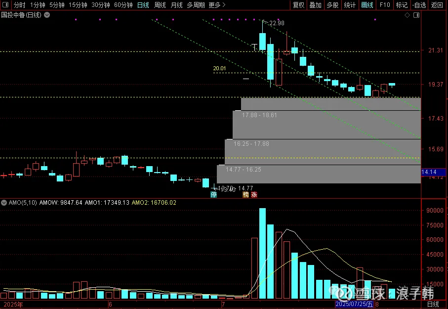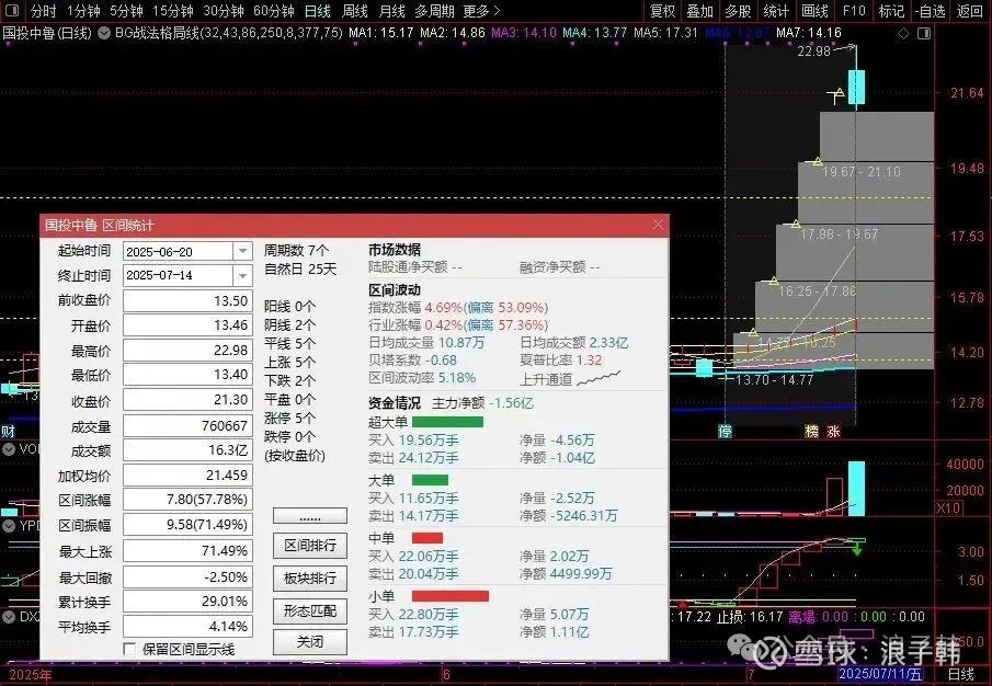 1、国投中鲁2025年7月14日开板首日放量K线图。