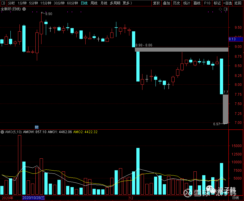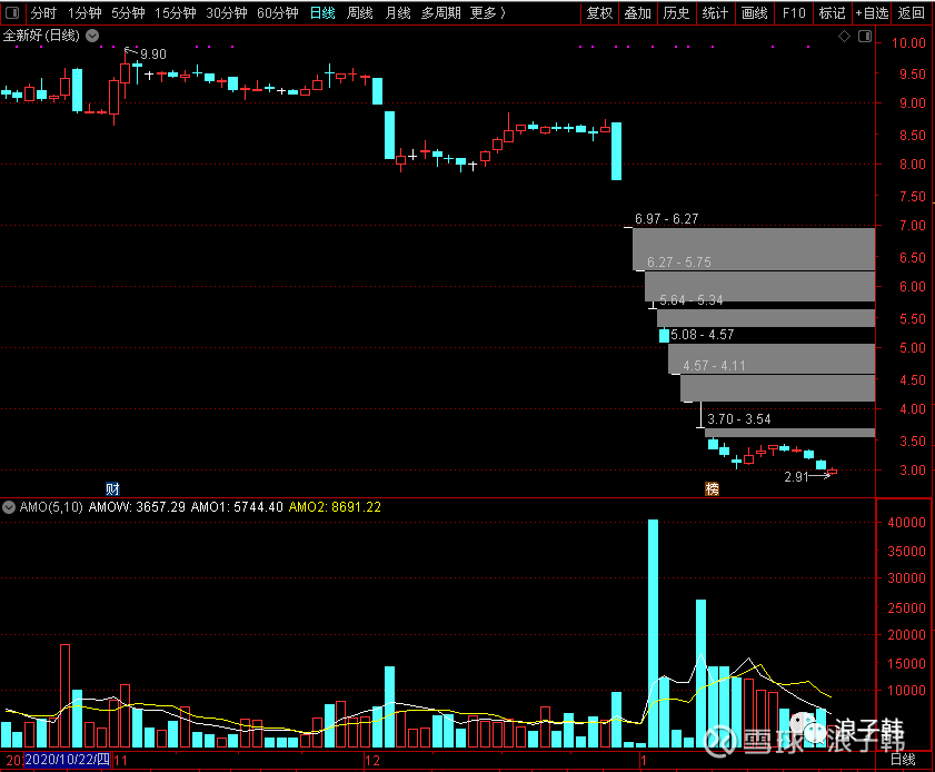 @全体成员 想写一个全新好的续篇。大家看,我们在2020年12月31日当时点评这个票时,专位写了一个博客文章,20201231子韩聊股:第47课之全新好连续2个跌停板之前从技术分析方面能否识读?答案是肯定的,能!,那么,到今天2021年1月26日,在过了17个交易日之后,大家看到了第一个图的情况,该股已经由8.5元跌到了目前的2.91元,跌掉了5.59元,并且今天创出了本轮下跌的新低2.91元。