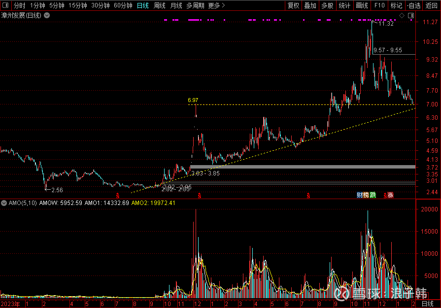 大家看,这个漳州发展$漳州发展(SZ000753)$,两条线,道出了,该股明显了的两种推升轨迹,向上斜推线和7元的突破后的关键支撑线,11.32元头部产生后,倒V头部震荡套区已经形成,目前这个震荡区域中,两条线正要相逢,未来是龙还是虫,是高位横向震荡一段时间后继续第二波上攻之旅,还是转入下跌阴跌绵绵无绝对期,值得后期重点跟踪关注。师:成都浪子韩