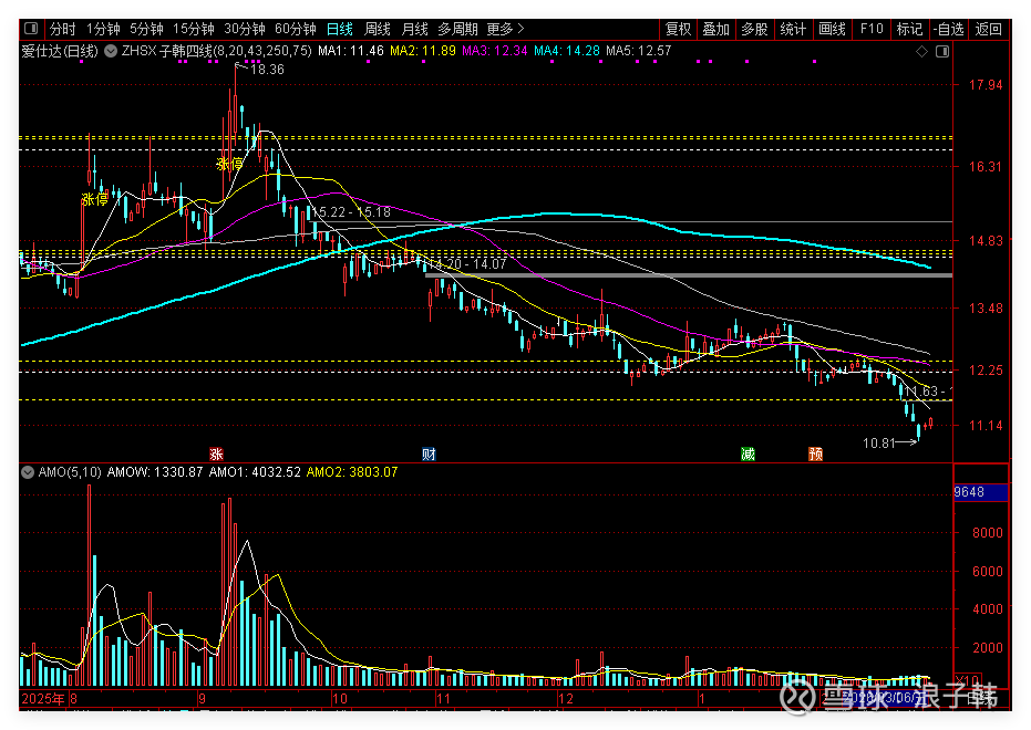 其实,就爱仕达这个票的走势来看,作为新散户而言,在高位18元追高买入之后,就需要主动性预防,这个票会否在未来出现高位派发和连续阴跌,不断阴跌,绵绵无绝期的下跌盘跌的走势!这个是不得不防的。