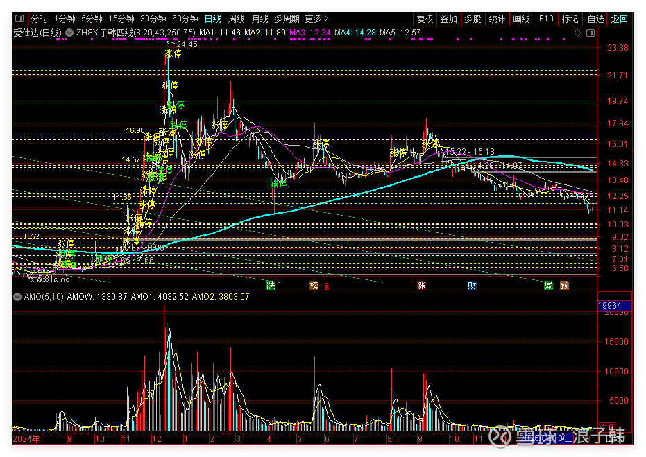 从爱仕达的最后一图中所表现的,整体连续板推升走势图!我们可以一览:主力在这个票的所运用的相关手法,不是任何一个个股在类似爱仕达这样的推升走势之后,在创出24.45元天价头部之后,就能够在回撤50%震荡之后,又能够拉起并再创新高的。而对于大部分类似这样的拉升个股而言,由7元拉到24元用了20个或30个交易日完成主推升段,翻了3倍之后,在尾段就会进行相对高位的派发区,这个派发区的震荡时间将视个股消息面和主力的筹码整体套利完成情况来进行综合考虑,可长可短,短期的有2个月左右就会进行大幅下杀;中期的有6个月左右的高位震荡区间区域性派发;中长期有12月左右的中位横向震荡区域间的派发,但是,在这短、中、中长期的三种派发套利结构中,没有一种能够可以给你说,它最终能够再起第二波推升并再创新高,或再第三波或第四波推升并再创新高。