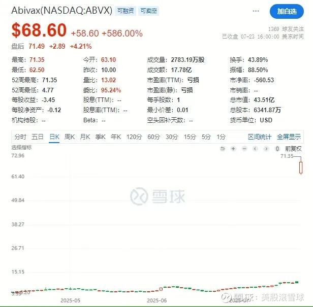 此消息促使Abivax股价单日飞涨586%,创下今年以来美国biotech单日最大涨幅,公司市值也由6.3亿飙升超40亿美元。