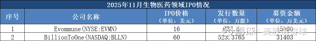 2025年11月,在生物医药领域,有2家公司以IPO的方式赴美上市,市场较为清淡。
