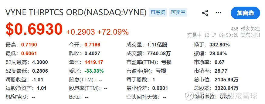1、VYNE THRPTCS(NASDAQ:VYNE)