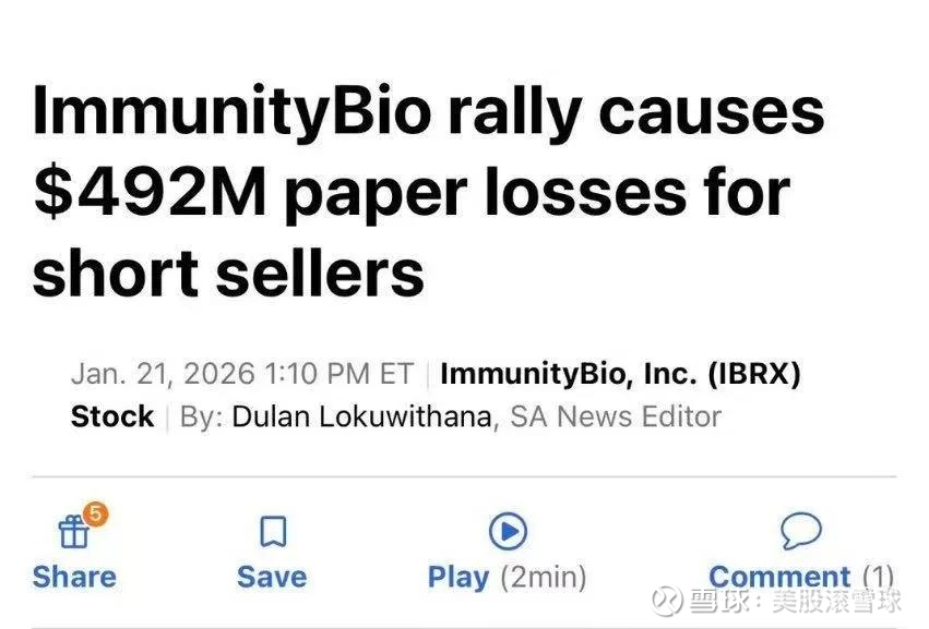 此外,作为连续下跌长达五年之久的ImmunityBio,早已成为各路做空资本的热衷标的,长年保持高水位的做空比例,但2025年以来的各种利好,让公司股价迅速上涨,做空力量被迫不断止损,推动股价上行,公司市值一度超过百亿美元。据相关报道,仅在1月的上半月,空头的损失就高达4.92亿美元。