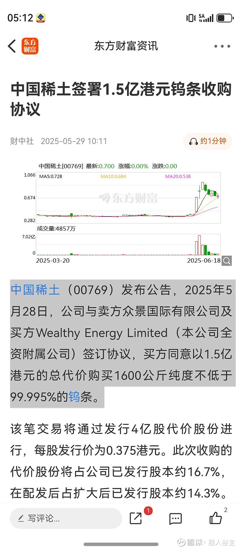 还记得这个事吗?这批钨条赚疯了吧。中国稀土(00769)发布公告,2025年5月28日,公司与卖方众景国际有限公司及买方Wealthy Energy Limited(本公司全资附属公司)签订协议,买方同意以1.5亿港元的总代价购买1600公斤纯度不低于99.995%的钨条。