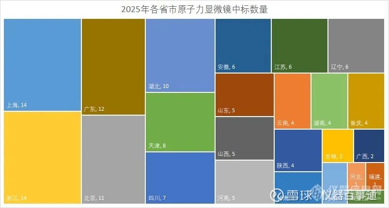 第一梯队(≥10台):上海、浙江(各14台)并列首位,广东(12台)、北京(11台)、湖北(10台)紧随其后。这四个省市合计采购61台,占全国总量的44.53%,是原子力显微镜采购的绝对核心区域。