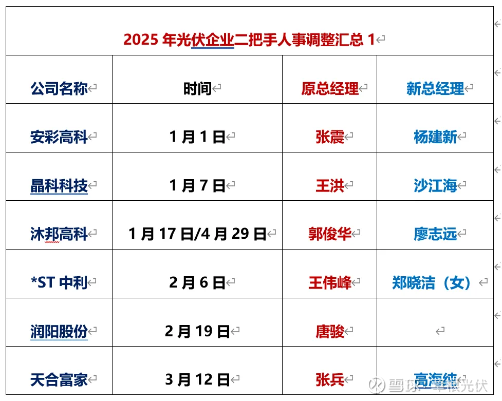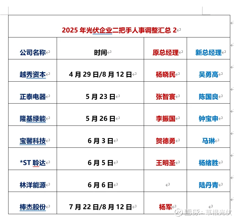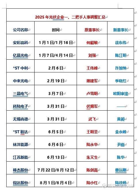 据不完全统计,2025年1月1日迄今,共有21家光伏企业出现董事长、总经理/总裁级别的职务调整,涉及44人次。其中,有的企业是因公司内部战略调整需要而更换一、二把手,有的是因到龄退休离任,有的则因实控人变更或公司发展需要因素而“下课”。